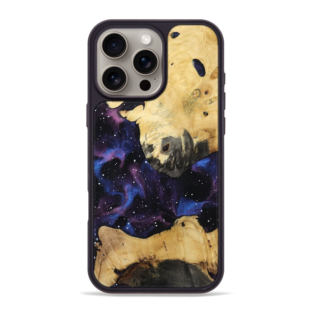 Simone features a warm, light wood grain that beautifully contrasts with a deep, swirling purple and blue background. The patterns create a sense of movement, evoking a cosmic feel that draws the eye.