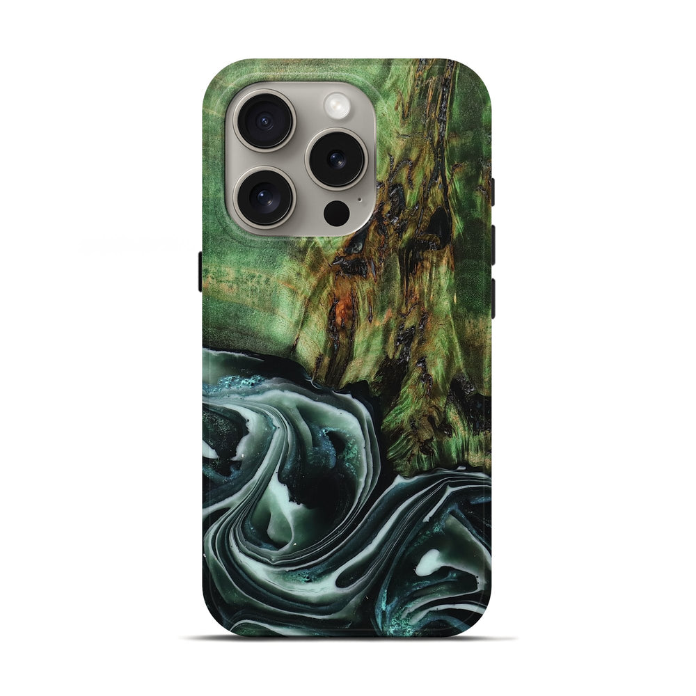 Our Live Edge cases are made from an amazing combination of stabilized wood burl and colored resin. Our stabilization process hardens the wood to protect against cracks and breaks. We do every step of the process at our shop in Northern Indiana. Perfectly fits the iPhone 16 Pro.