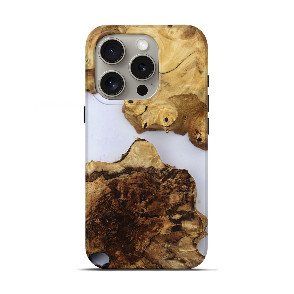 Our Live Edge cases are made from an amazing combination of stabilized wood burl and colored resin. Our stabilization process hardens the wood to protect against cracks and breaks. We do every step of the process at our shop in Northern Indiana. Perfectly fits the iPhone 16 Pro.