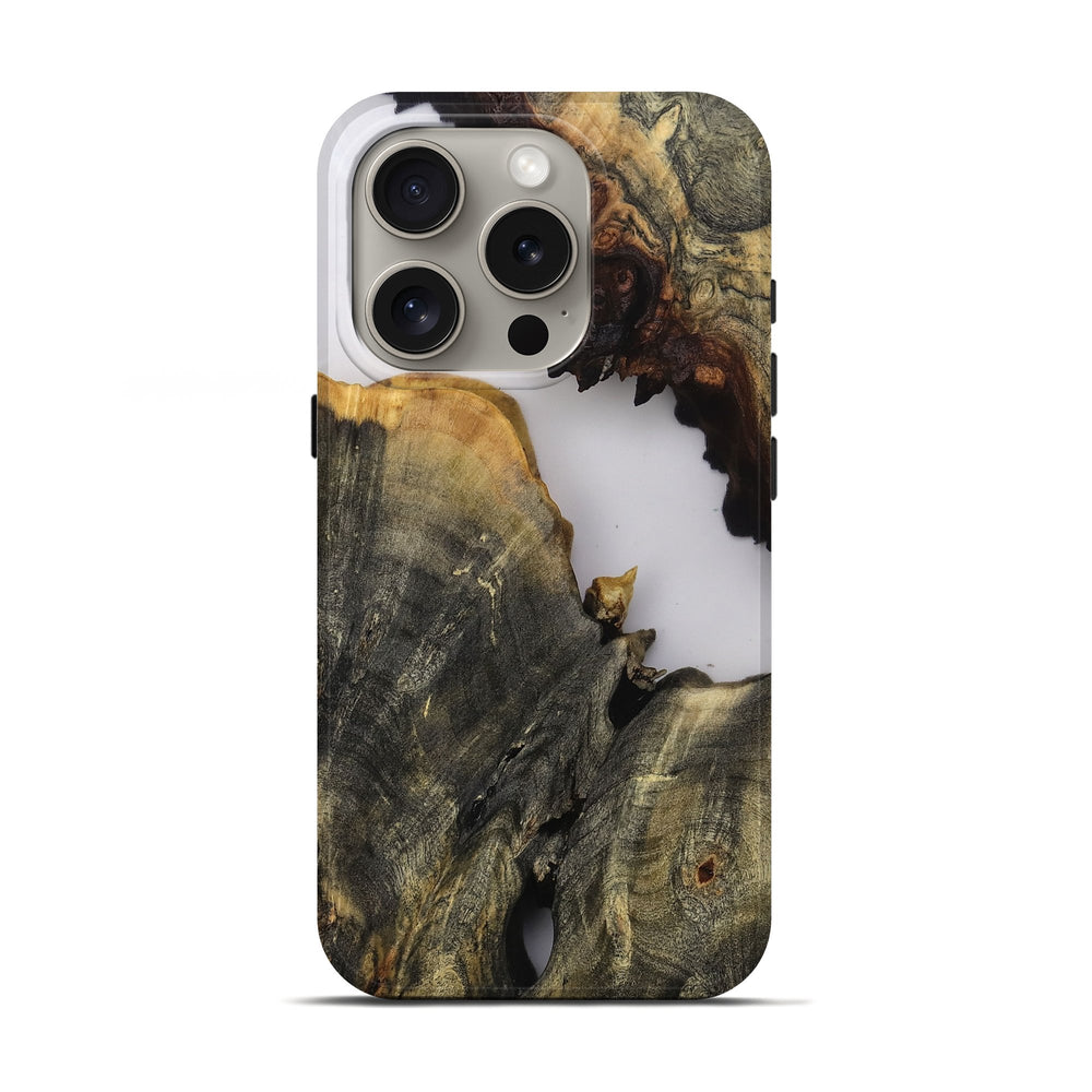 Our Live Edge cases are made from an amazing combination of stabilized wood burl and colored resin. Our stabilization process hardens the wood to protect against cracks and breaks. We do every step of the process at our shop in Northern Indiana. Perfectly fits the iPhone 16 Pro.