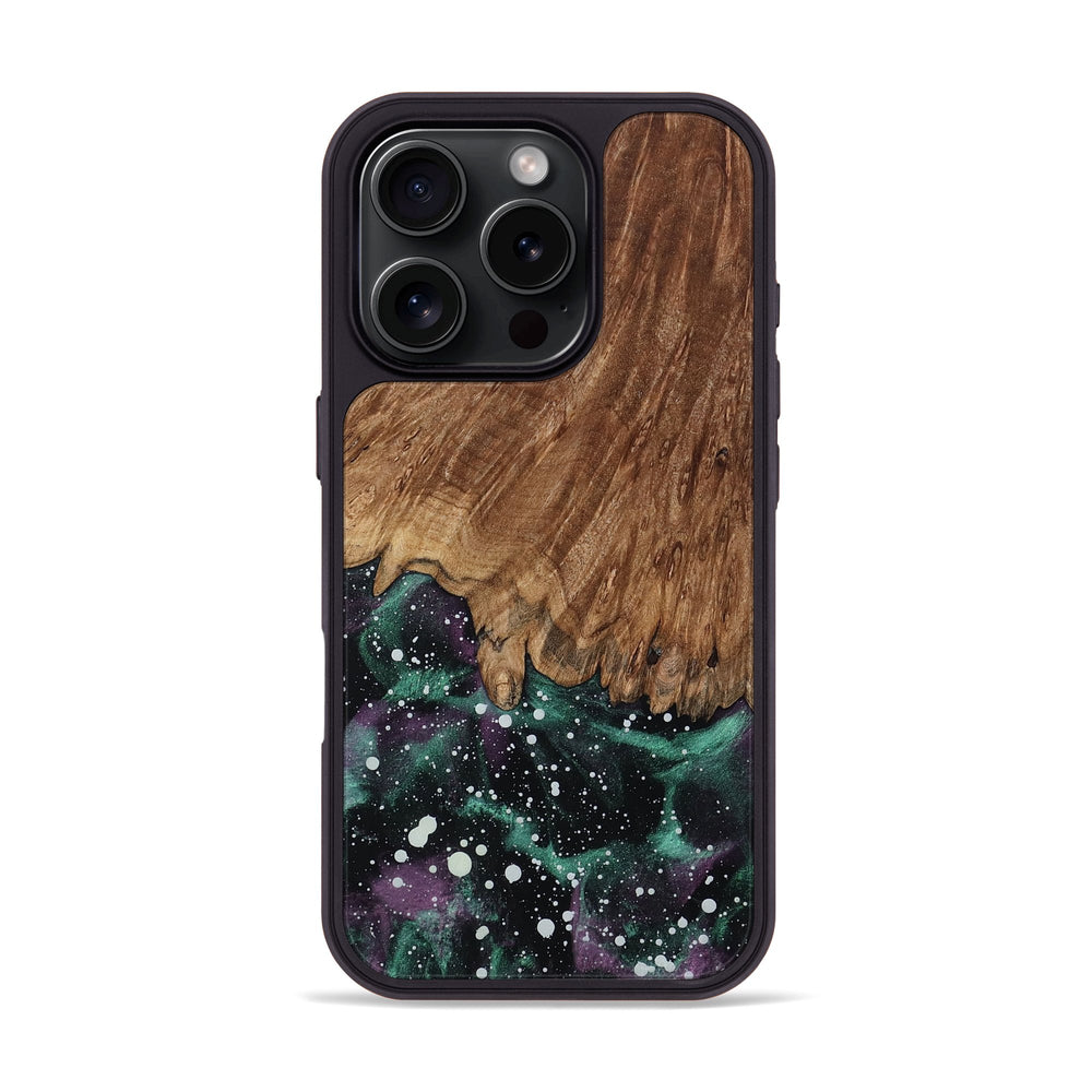 Jakob has rich, warm tones that highlight its natural grain. The smooth surface flows into a cosmic backdrop of dark greens, purples, and white dots.