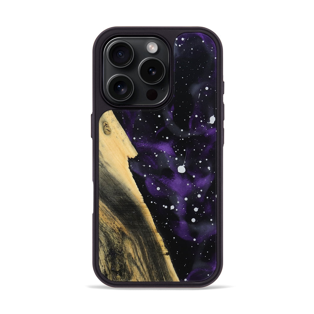 Jerald is a piece of Buckeye wood with a unique blend of natural colors and soft lines. It features a striking contrast between the light wood and the deep purple and black background, creating a cosmic feel.