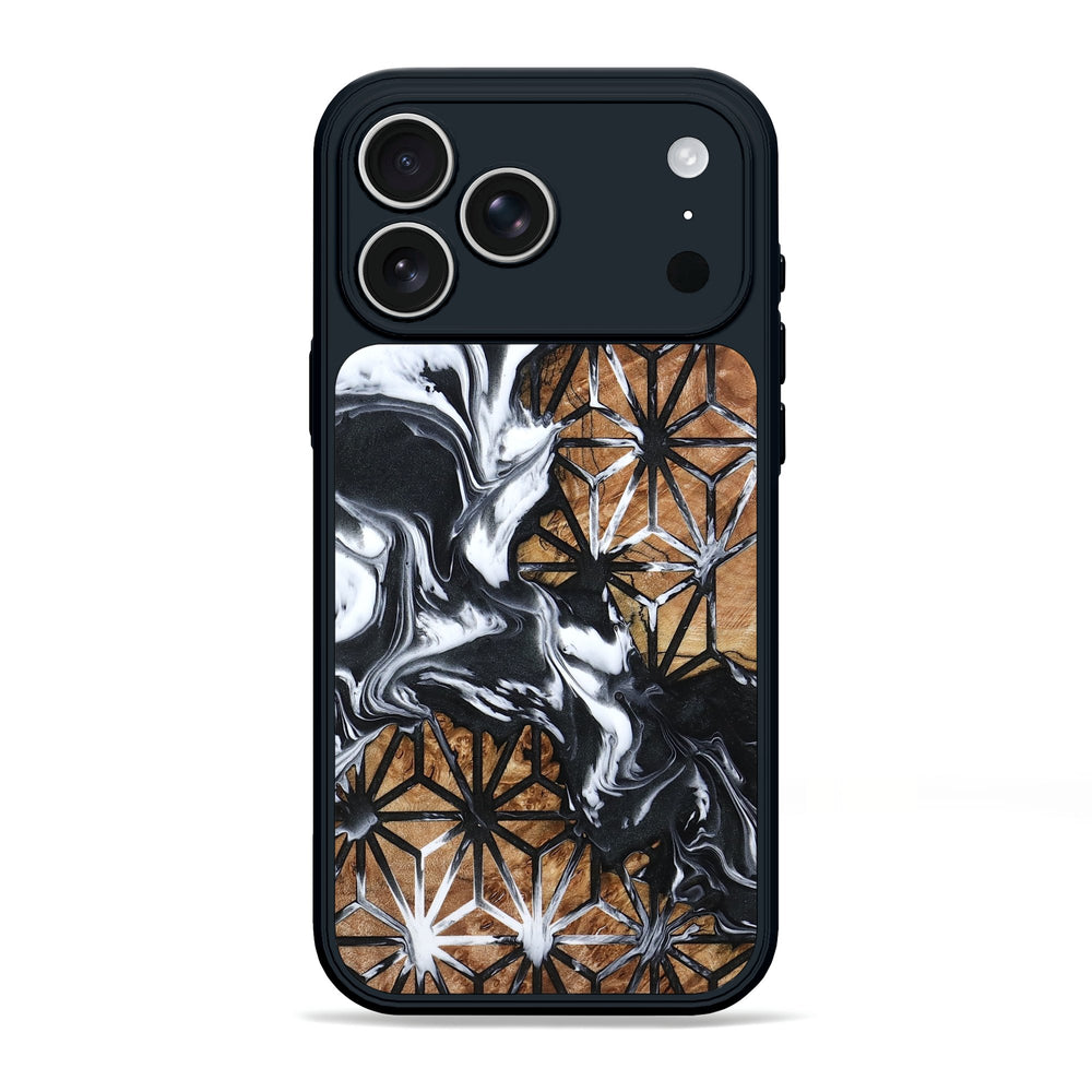 Emmalee has a warm, rich Maple wood base that showcases its natural beauty. The swirling black and white patterns create a striking contrast against the golden tones of the wood, forming a unique geometric design.