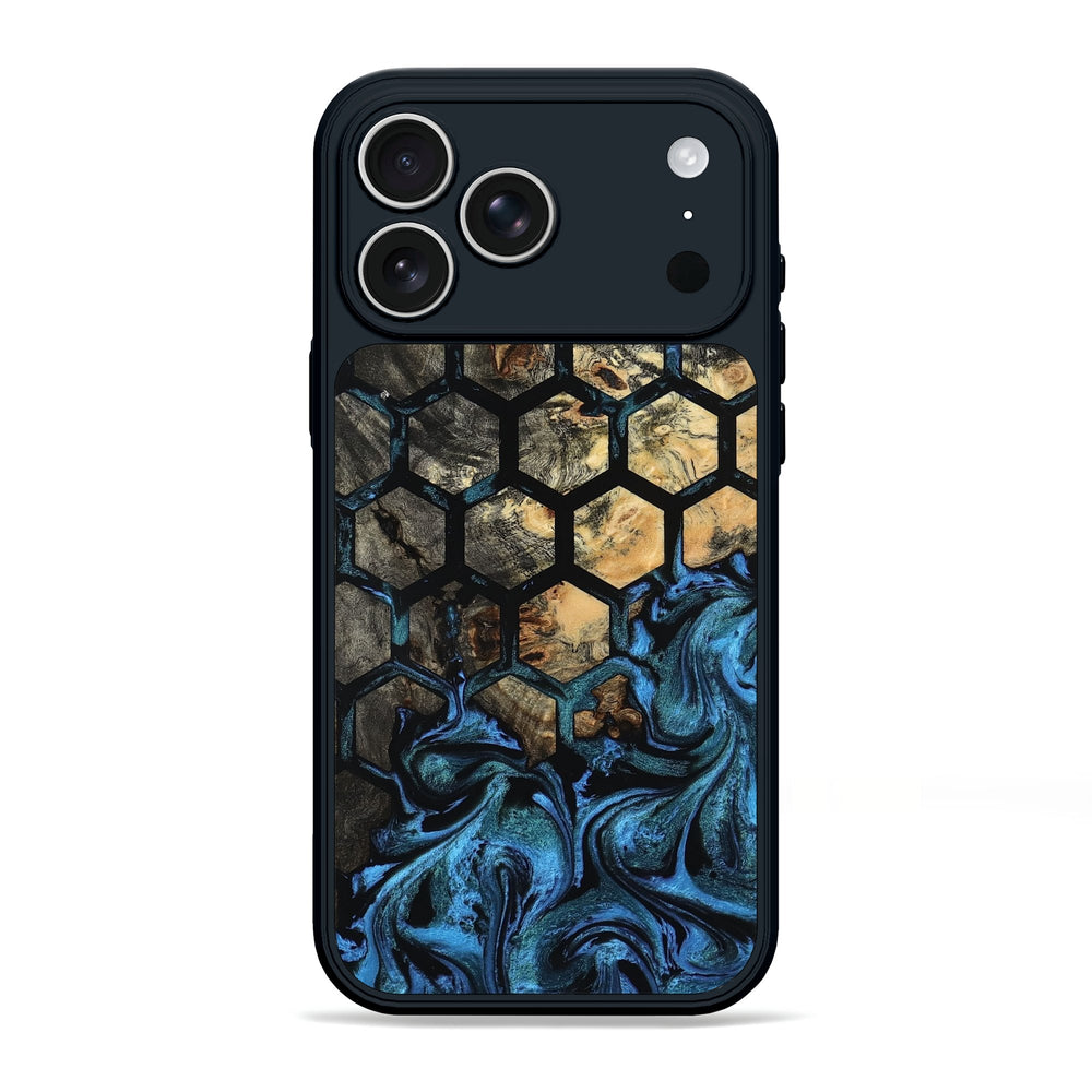 Lucian has a unique pattern of hexagons that highlights the natural beauty of the Buckeye wood. It features swirling blue and earthy tones that create a calm and inviting look.