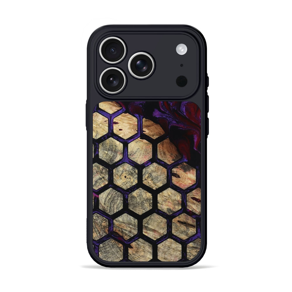 Anabel has a striking combination of rich purple swirls and a honeycomb pattern. The light tan wood creates a warm backdrop that beautifully contrasts with the vibrant colors.