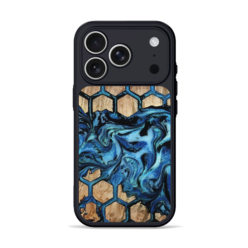 Camille has a warm, natural beauty with honey-colored Maple wood. It features a striking pattern of hexagons, complemented by swirling shades of blue and black.