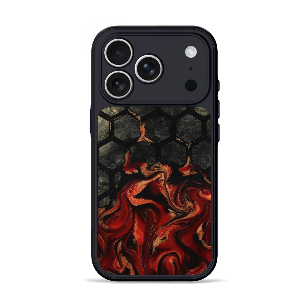 Kirsten has a striking blend of bold red and black swirls that create a dynamic, flowing look. It features a unique hexagonal pattern that adds a touch of structure to the vibrant design.