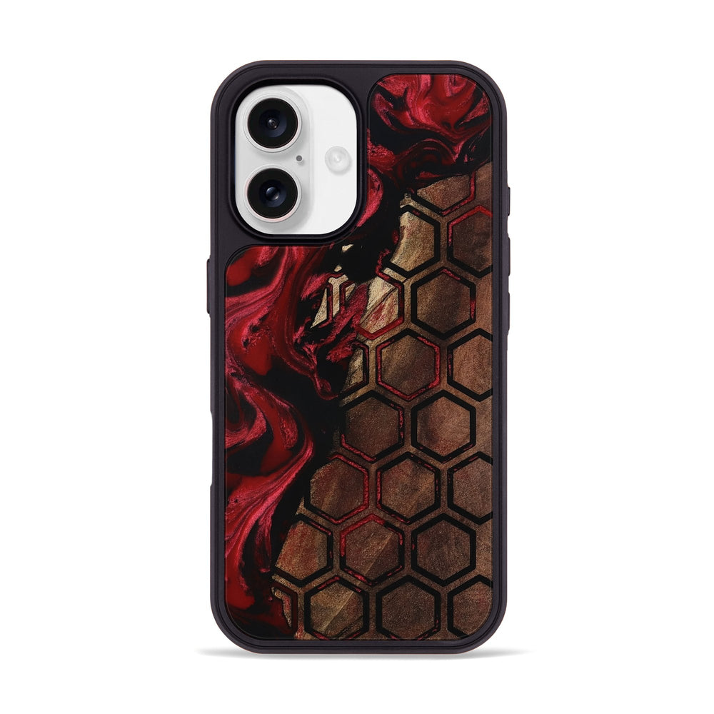 Carlie has a warm, rich Maple wood tone that highlights its natural beauty. It features a striking pattern of hexagons along one side, adding an interesting contrast to the flowing red details.