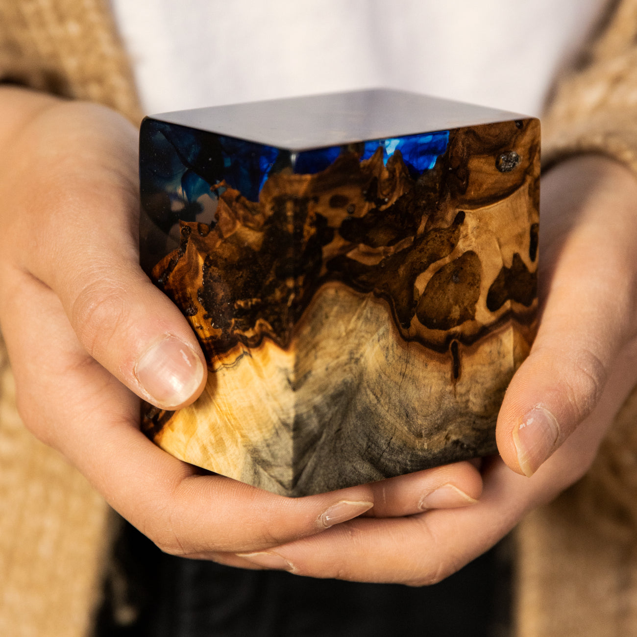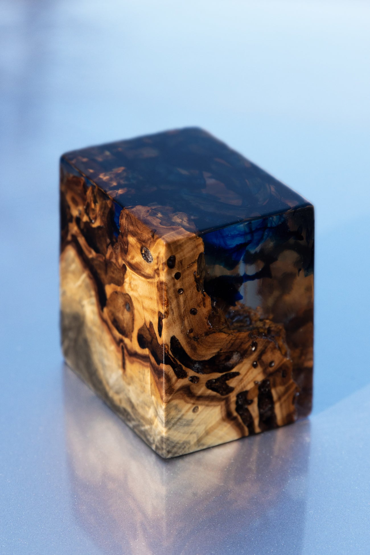 Our Monolith is made from burl wood and resin. We stabilize the wood to help it resist humidity changes, then add resin, dyes and pigments. When the finished part has fully hardened, we cut it to size and polish it to an almost mirror finish.