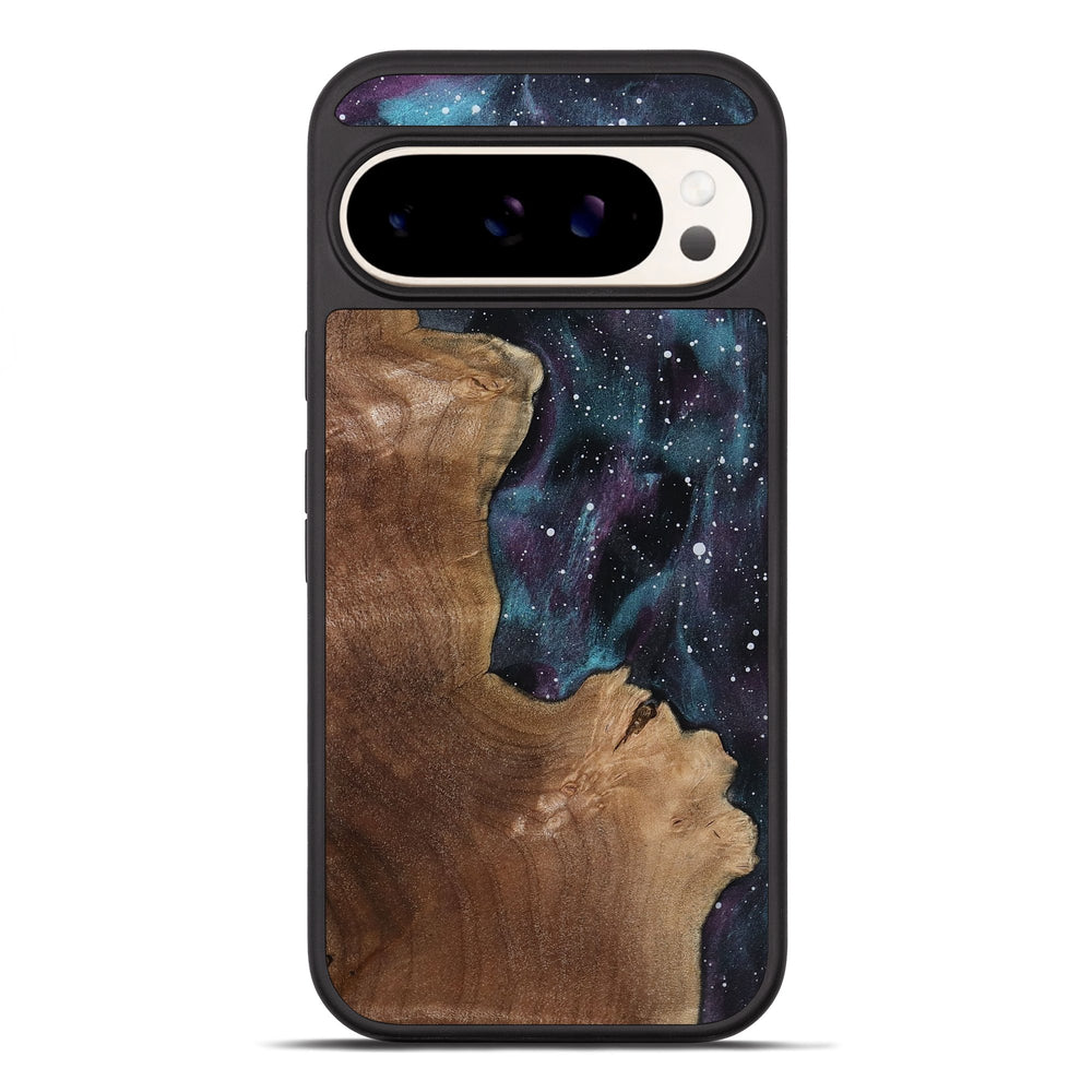 Cordell has warm, rich tones of maple wood that highlight its natural grain. The dark, colorful background creates a beautiful contrast, giving it a cosmic feel.