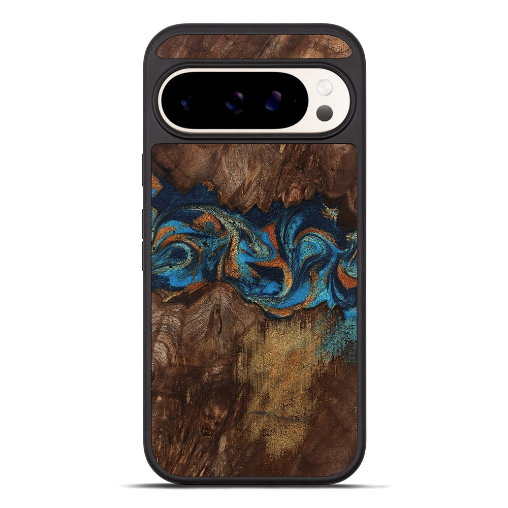 Marion has a rich, warm brown color with striking blue and orange swirls. The wood's natural grain creates a beautiful contrast, adding depth and character.