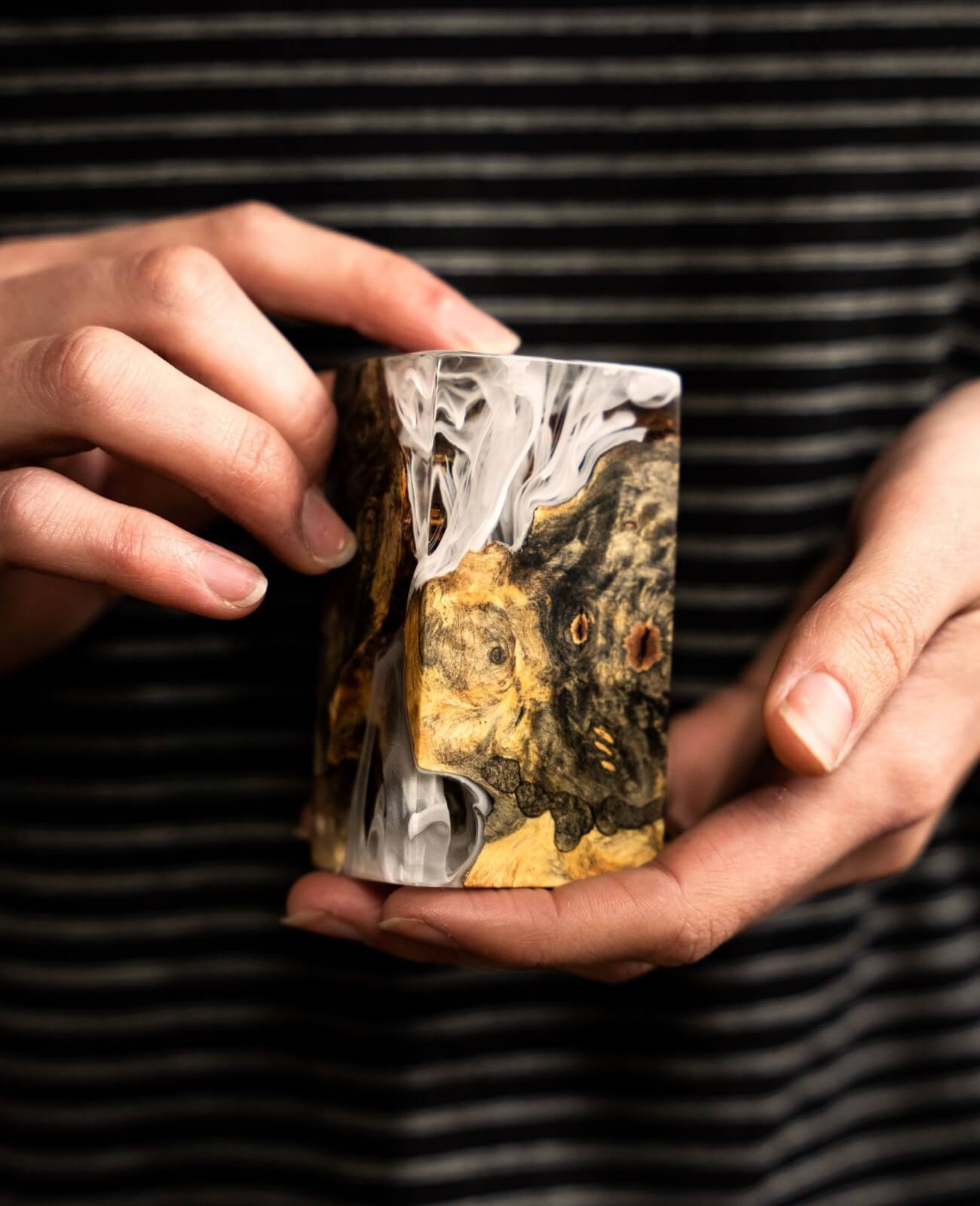 Our Monolith is made from burl wood and resin. We stabilize the wood to help it resist humidity changes, then add resin, dyes and pigments. When the finished part has fully hardened, we cut it to size and polish it to an almost mirror finish.