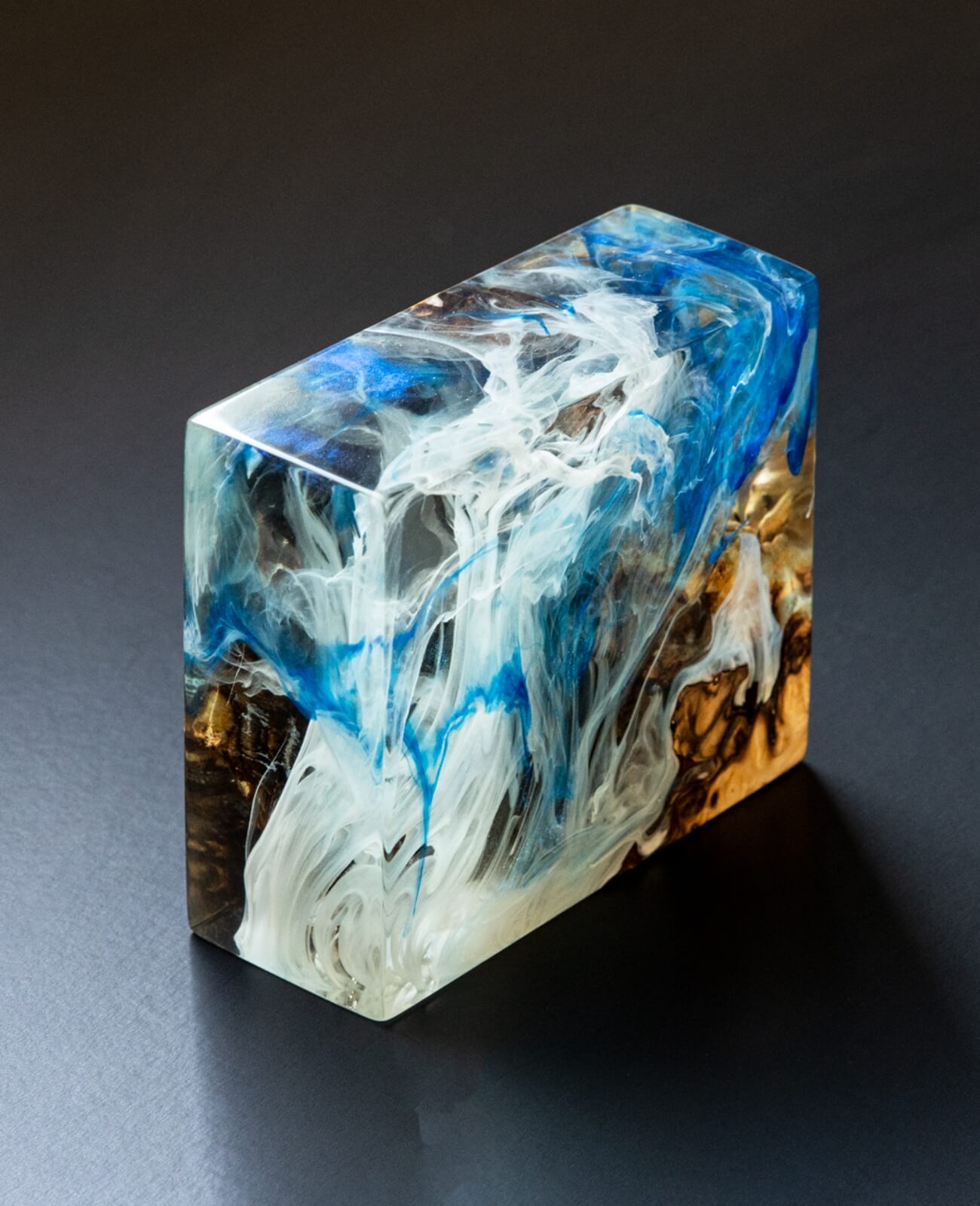 Our Monolith is made from burl wood and resin. We stabilize the wood to help it resist humidity changes, then add resin, dyes and pigments. When the finished part has fully hardened, we cut it to size and polish it to an almost mirror finish.