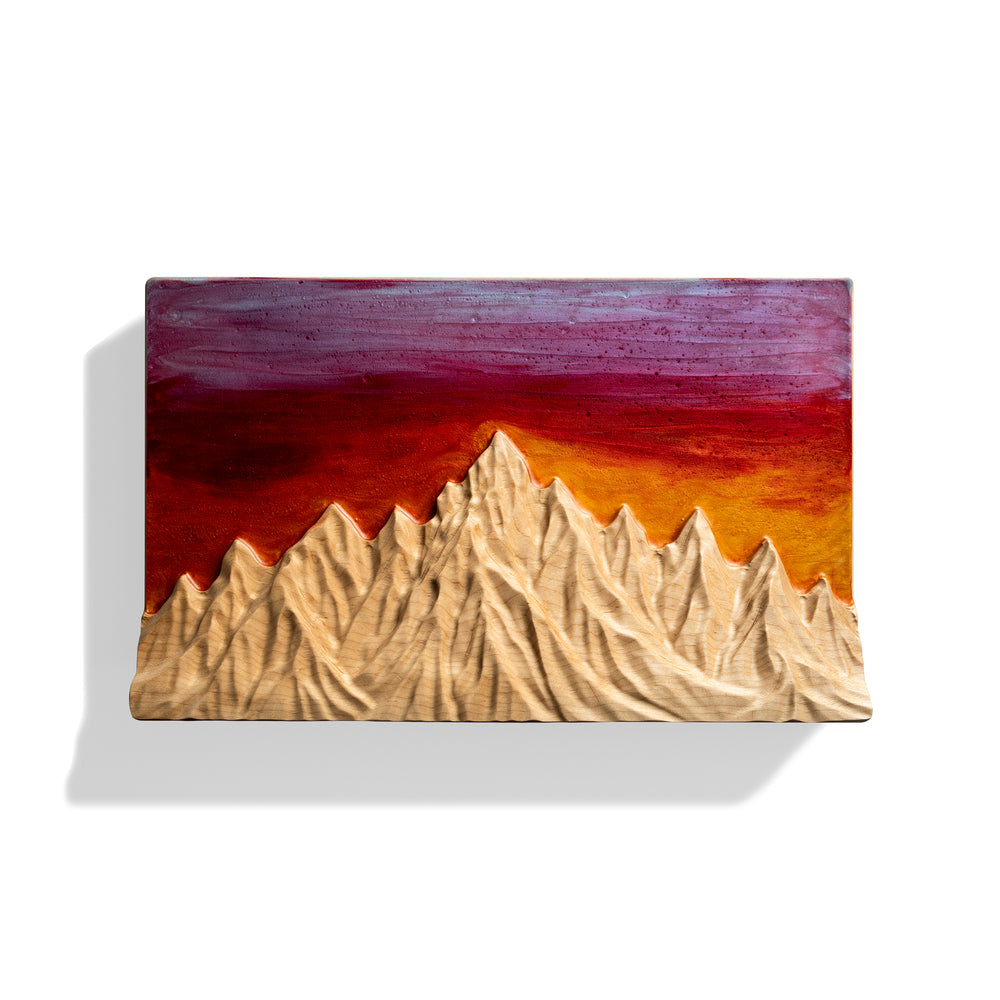Inspired by the warmth of the setting sun casting light across distant peaks, Sunset Peaks captures the quiet beauty of the day’s final glow. Each 16" × 10" × 2" piece is carved in Elkhart, Indiana from solid maple, blending flowing 3D mountain textures with a hand-poured resin sunset sky.